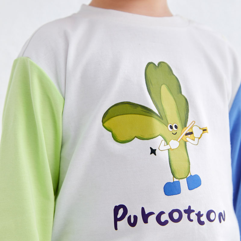 液態(tài)棉針織面料,手感柔軟爽滑;拼撞色袖款式更添時尚感;圖案萌趣可愛。